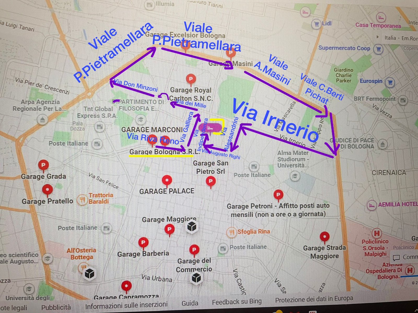 Tuttavia se doveste aver necessità di tornare in hotel per caricare in auto bagagli e/o persone, il percorso in viola nella mappa sotto è quello indicato per non rischiare di percorrere strade con corsie preferenziali.